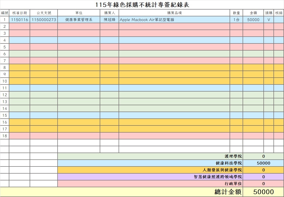三、115年綠色採購不統計專簽紀錄表(註:本年度預計上限金額為80萬元)